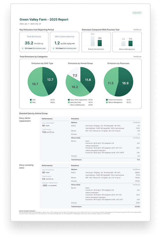 GHG Account makes it easy to calculate and report farm-level emissions in compliance with international standards (Tier 2). With Methane Monitor capsules, you can achieve the highest level of accuracy (Tier 3) for emission measurement—and when reduction activities are applied, secure premium carbon credits.
